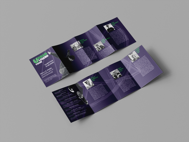 Im zweiten ÜK bestand unsere Aufgabe darin, fünf zusammenhängende Produkte zu gestalten, drei in Gruppenarbeit und zwei in Einzelarbeit. Ziel war es, ein einheitliches Erscheinungsbild zum Thema Urban Legend zu entwickeln. Urban Legend ist ein fiktives Unternehmen aus der Skateboarding Szene, das eine internationale Tour plant. Für den Event in der Schweiz sollten wir passende Werbematerialien entwerfen, die den urbanen und sportlichen Charakter der Marke widerspiegeln. In der Gruppenarbeit gestalteten wir das Logo, ein Plakat sowie einen Styleguide, der das visuelle Erscheinungsbild festlegt. In der Einzelarbeit erstellten wir ein Mockup des Plakats und einen Falzflyer, der das Eventprogramm und die Profiskater präsentieren soll. Alle Produkte sollten optisch und gestalterisch aufeinander abgestimmt sein, um ein stimmiges, modernes Gesamtbild zu schaffen.